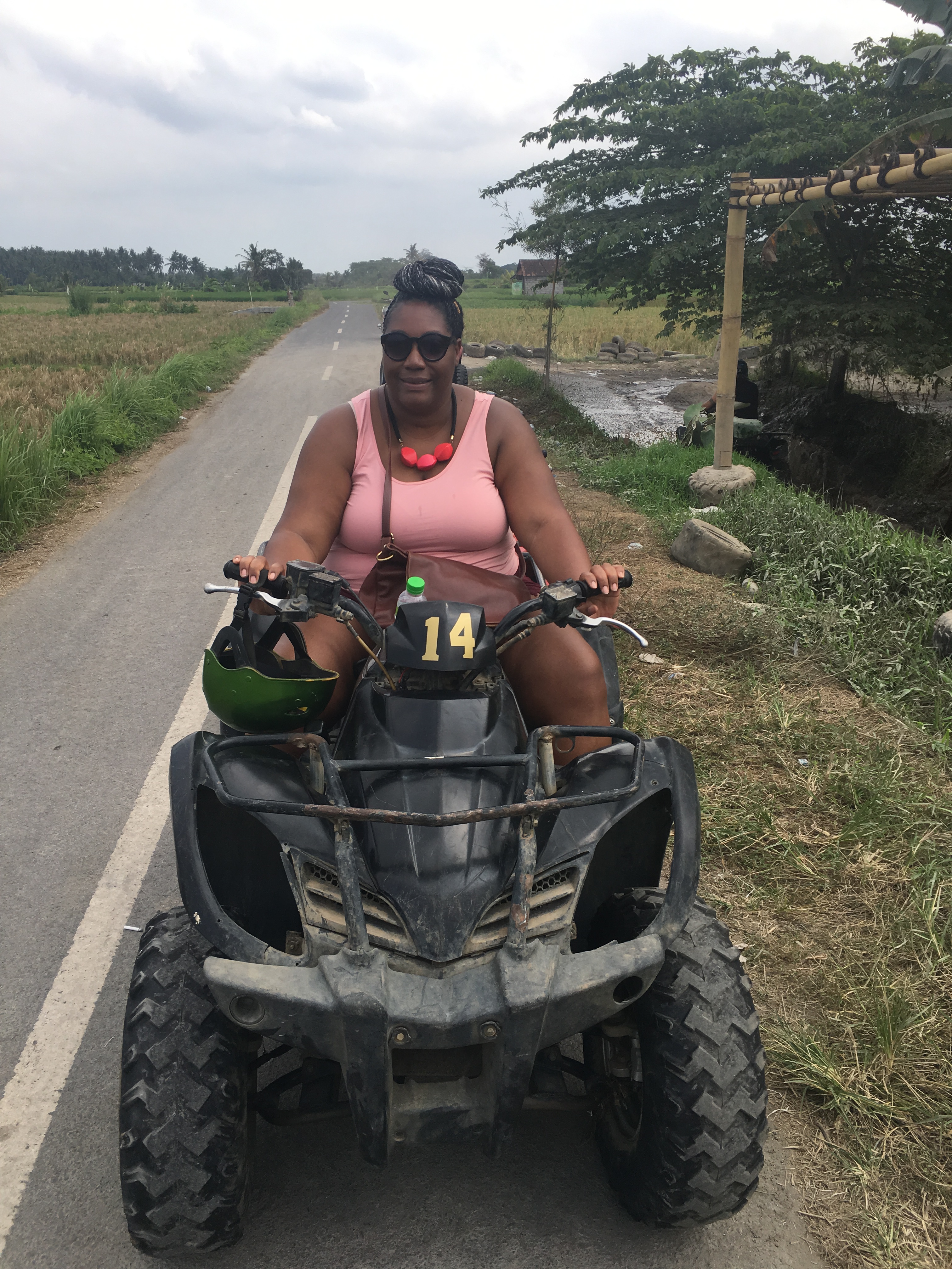 Agung picked me up this morning to head to Ubud. It’s only 15 miles, but according to Waze it will take an hour to get there due to the traffic and slow roads in general. According to my schedule I will be visiting the Sacred Monkey Forest,Tirta Empul Holy Water Temple, and a coffee/tea plantation before checking into Artotel. Evidently at monkey forest there is a gangsta monkey to take a picture with. In the way to Ubud, Agung suggested riding ATV’s to the rice fields. At first I was like I don’t know, but then my senses kicked in and I was like why not. It took the dry package, because I didn’t want to get dirty. Not a mistake; so much fun. Thankfully I had on shorts and tennis shoes and applied sunscreen this morning.