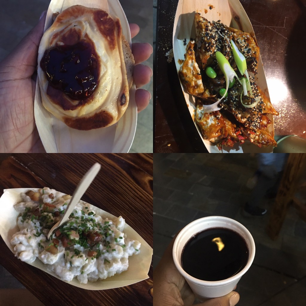 L to R: Grilled Cheese, Teriyaki Gyoza, Mulled Wine and Potato Dumplings.