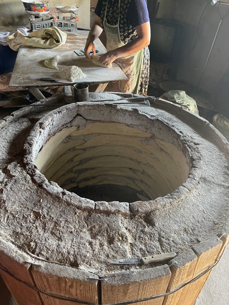 That averages to a 6.6, I would say closer to seven. After loading up the bus and counting heads, we headed toward the first winery, Kakhetian Traditional Winemaking. The outside decorations, store and sit down wine room was beautiful. I think for the sake of time and size of group they take you out to the factory where the large barrels are that store the wine. The sommelier or employee attempted to give us some background, but what really happened was she said this is white, this red, this is dry, this semi- sweet. I go to get the history as much as the tasting. After four varieties and 10 year old Brandy soaked in oak barrels we had time for pictures and purchases. But honestly, what did me in was the tour guide. I see the guide as the person that should be overwhelming knowledgeable, able to fill in the gaps with stories, rumors, etc. He didn’t have it and it never came. It was lovely to stop and view the process of traditional bread making. There was an old lady in a small house with lots of dough on the counter. She separates, kneeds, stretches and shapes with indentations in the middle. It in then placed the grooves of a concrete, oval shaped oven that is above ground but deep. The bread looked and smelled amazing but I just couldn’t bring myself to try it. No mask, no gloves and sweat. I also know my personal limits when it comes to traveling and making new experiences.