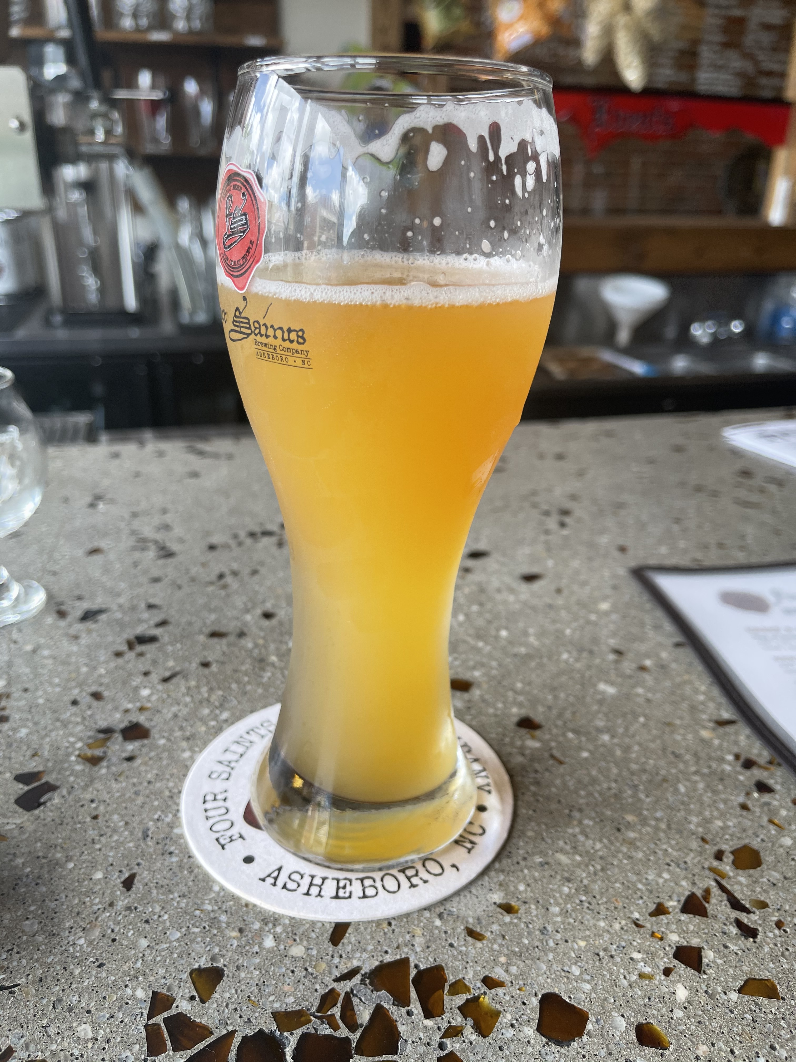 After my short hike, I decided to visit downtown Asheboro for craft beers at Four Saints Brewing Company and a calzone from the pizza shop next door. I tasted quite a few different beers along with the largest and best calzone I’ve had in years.
