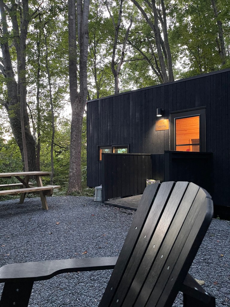 Each getaway house is approximately 1400-2000 square feet. Outside the cabin you will find a picnic table and lawn chairs. This area is used to reconnect. To enter the cabin you input the code that was sent to you via text. While the cabin is small, the very large window looking into the forrest gives the illusion that the space is bigger. Listed below are the amenities: